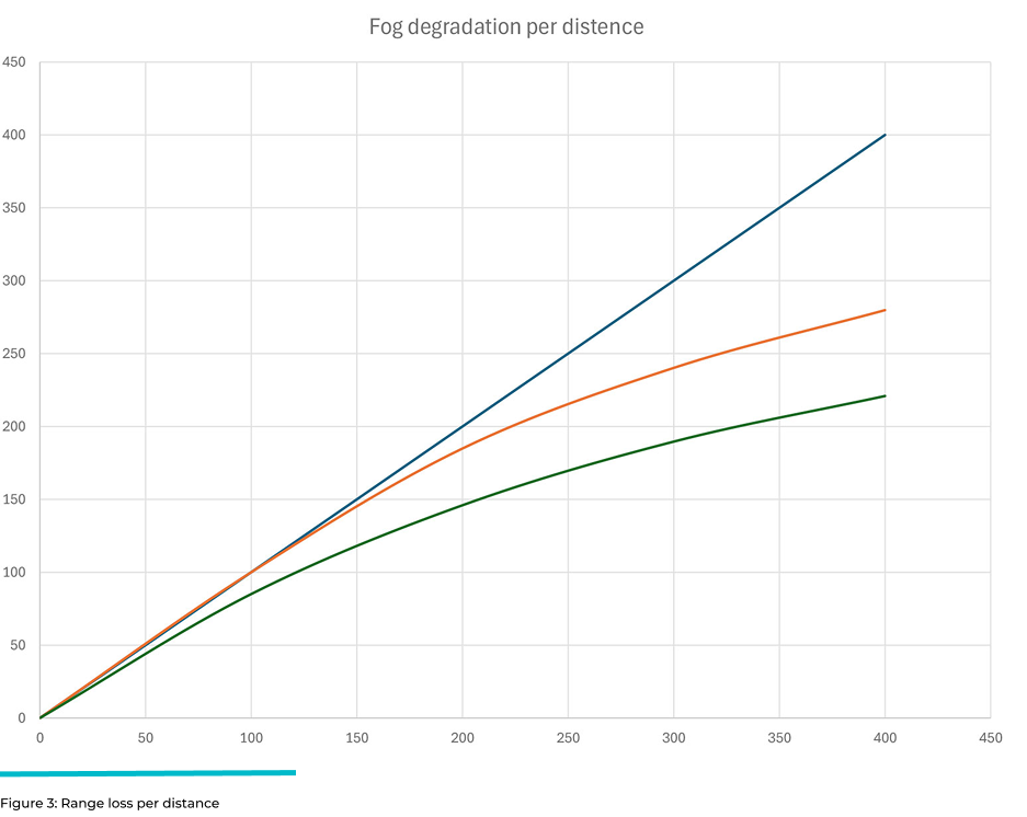 The following graph shows that FMCW performance in fog starts to degrade at roughly 25 meters, whereas ToF starts to degrade at around 125 meters. At 200 meters, FMCW degrades by about 17% more than ToF and continues to degrade to about 22% more than ToF at 400m.